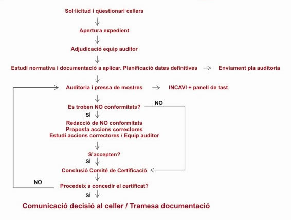 Aquest procés engloba la realització d’auditories als cellers objecte de certificació a través de l’avaluació dels sistemes de qualitat i producció amb la pressa de mostres dels productes i la avaluació de l’anàlisi fisicoquímic i organolèptic de verificació de conformitat del producte final.